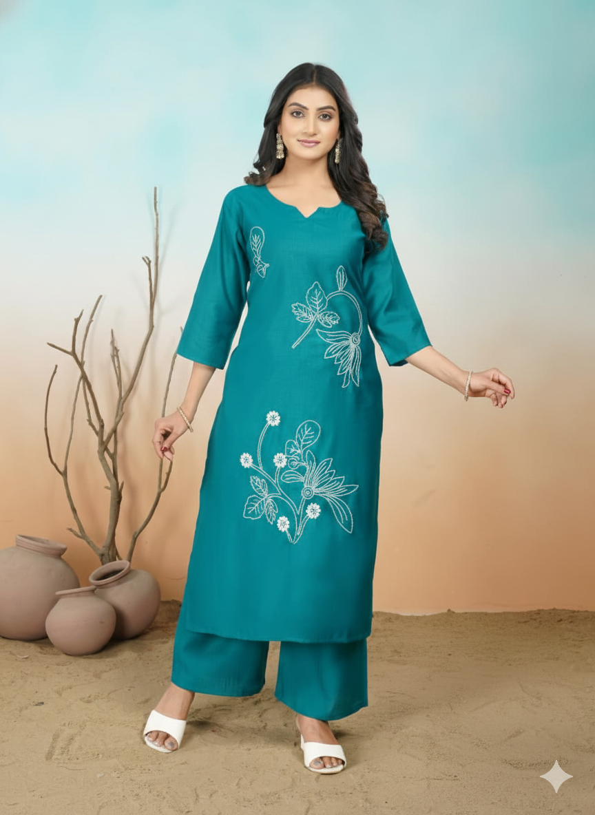 Designed especially for comfort and style, this vartican silk daily wear suit features embroidery sequence work and is perfect for everyday and office wear.