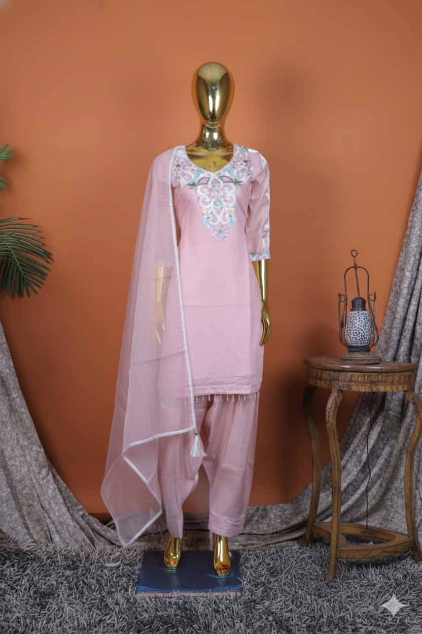 A stunning party wear suit made from glass roman fabric with heavy sequence work and embroidery. The organza dupatta adds elegance, making it perfect for festive and evening wear.